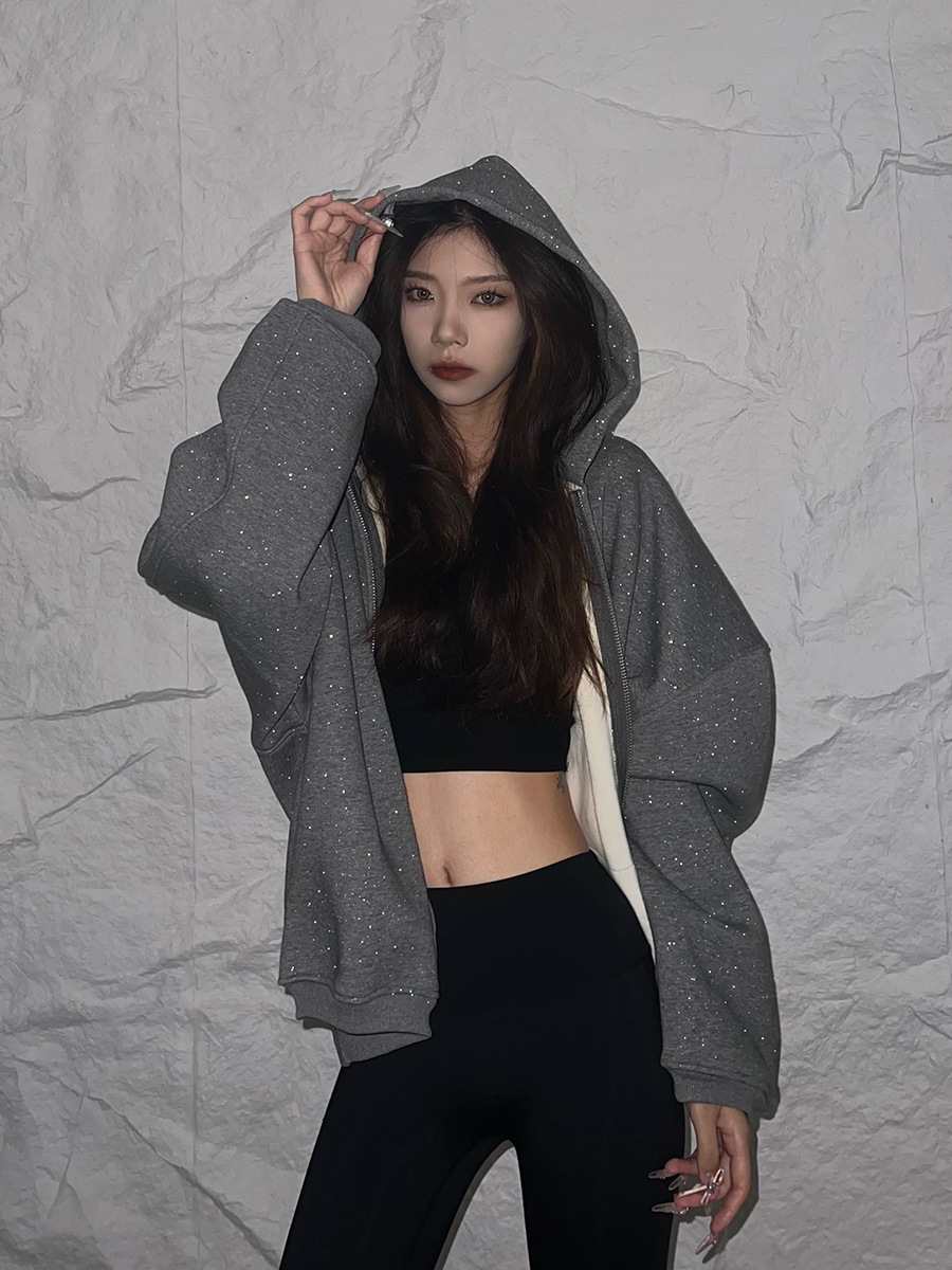 Gray sweatshirt 2.0 new version plus velvet hooded sweatshirt jacket warm versatile casual cardigan couple outfit