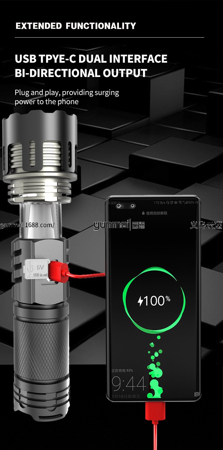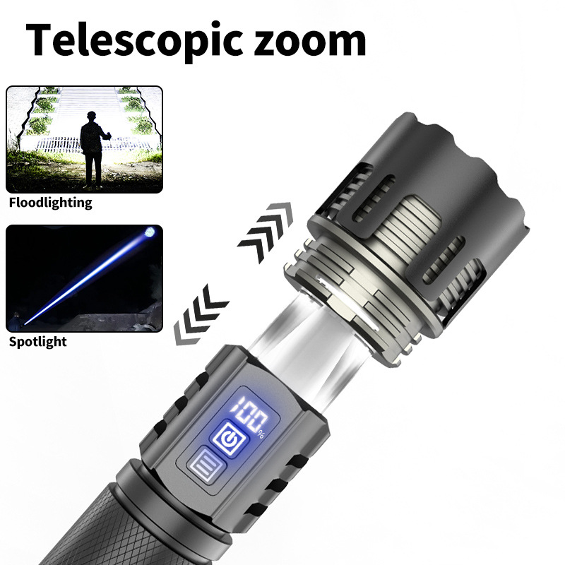 30W LED high-power long-range flashlight, multi-functional telescopic zoom flashlight with digital power display