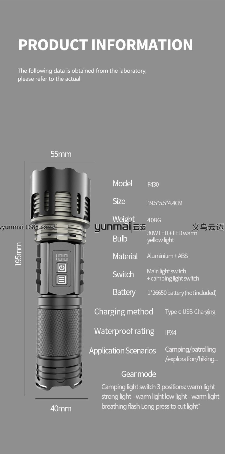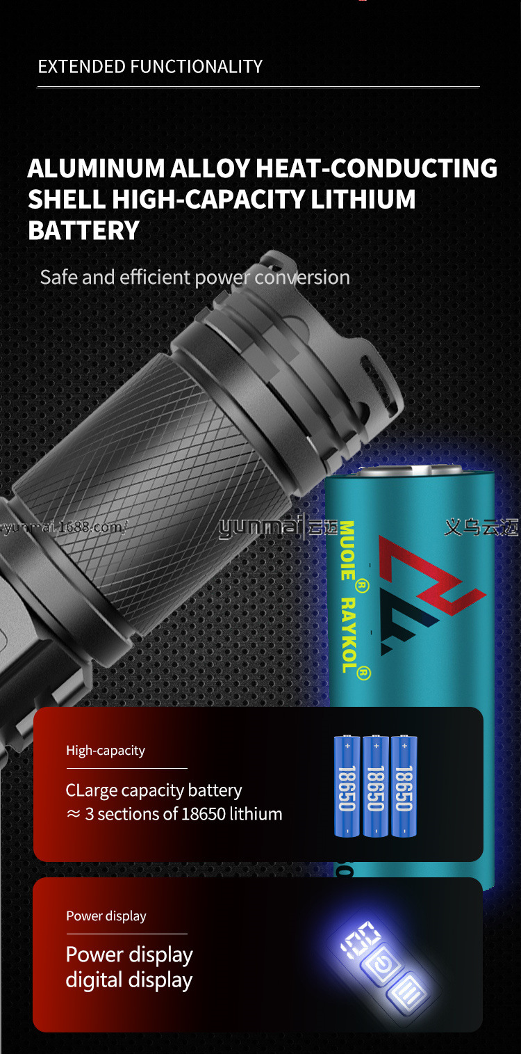 Features Bright white laser beam with long range, digital display, dual switch design, ambient light (can be used as a camping light), telescopic zoom, dual-range (long and short range), independent switch, supports input and output, can be used as a power bank in outdoor emergencies.