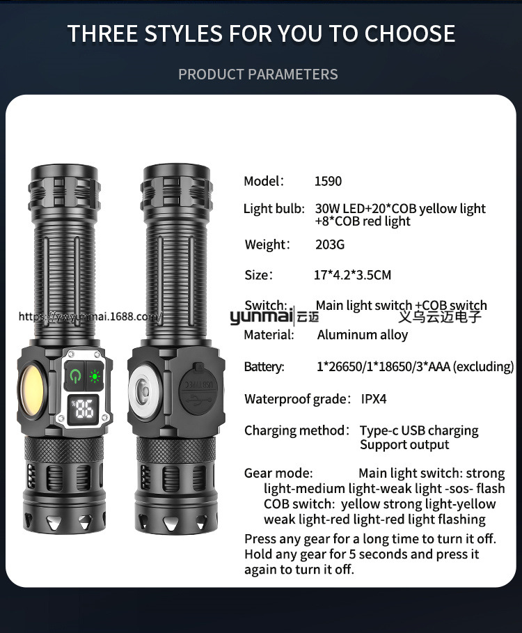 Battery 1*18650/1*26650/3*AAA (Not Included)