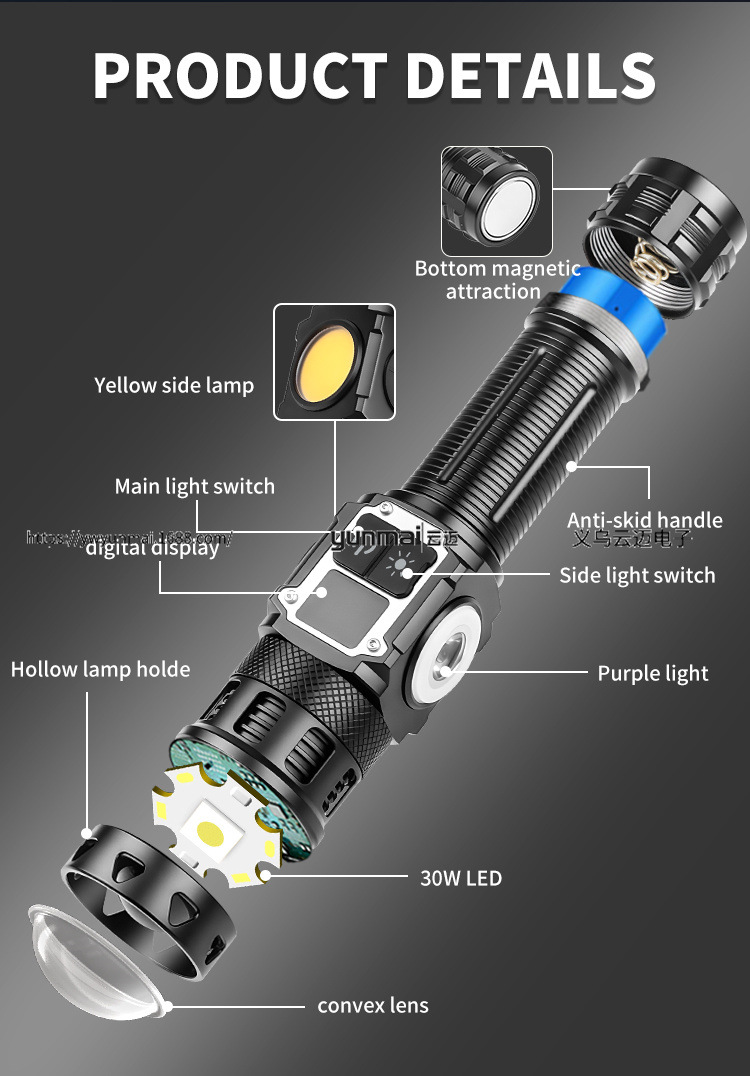 30W white laser + RGB + 395 UV multi-functional magnetic digital display high-power long-range flashlight