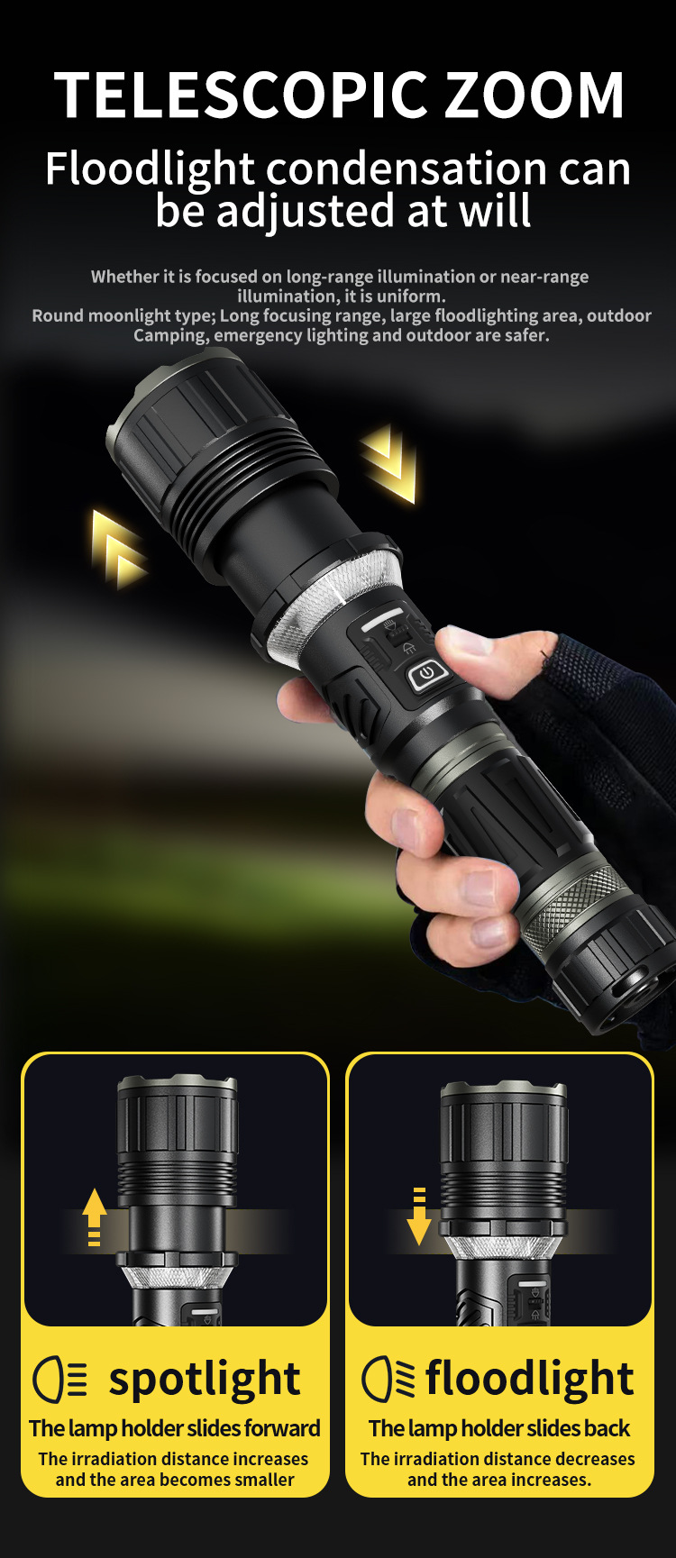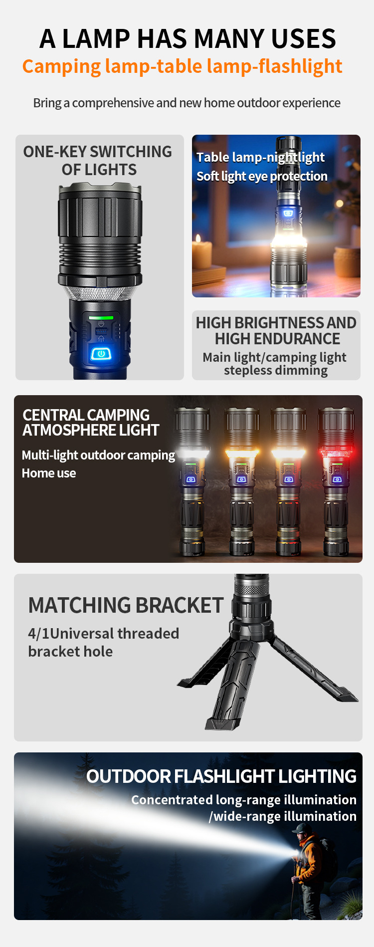Features: 50W white laser bulb, ultra-bright, long beam, lotus-shaped head (breaks windows), camping function, multiple light source options, can be used with a stand