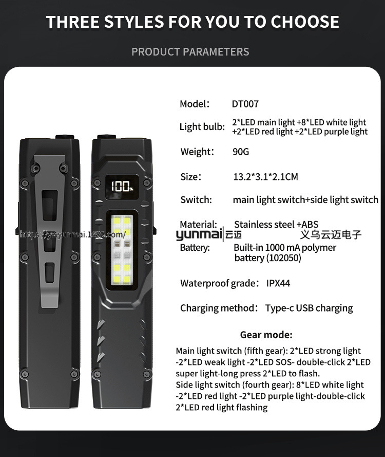 Side light switch (four levels): 8*LED white light bright - 2*LED red light bright - 2*LED purple light bright - Double press 2*LED red flash