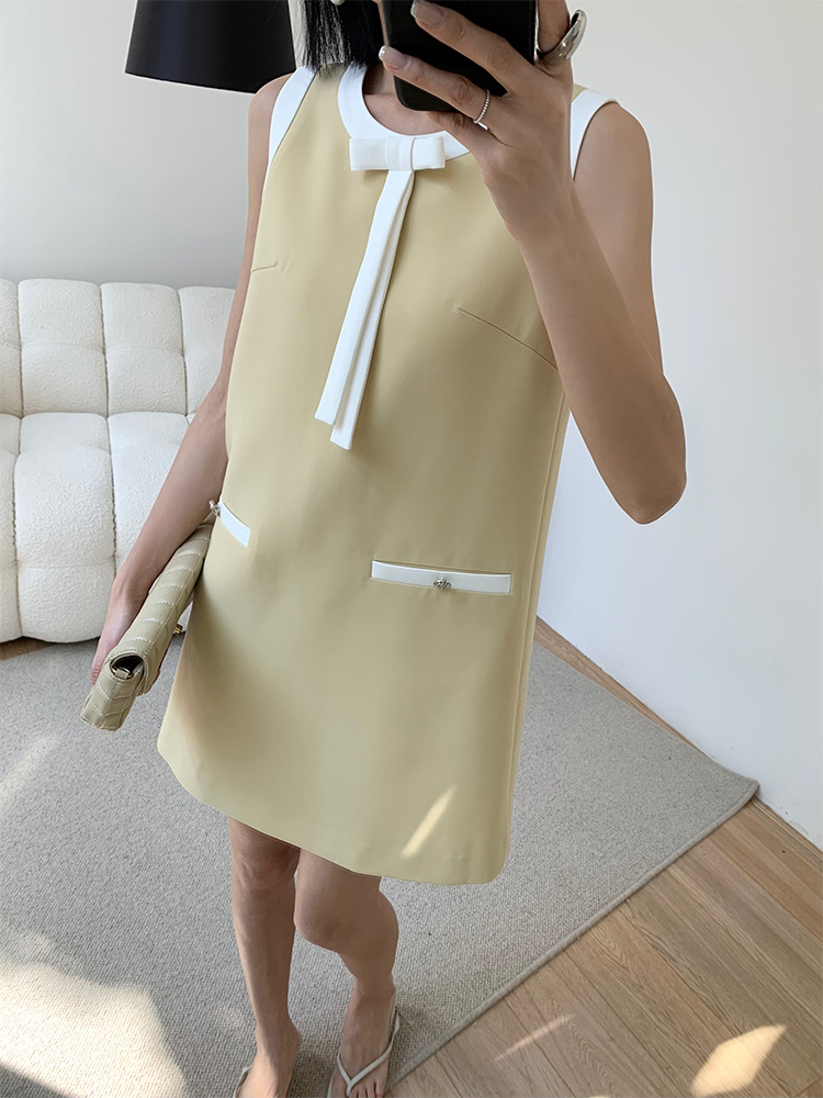 Summer French retro contrast color sleeveless dress bow ribbon straight skirt for women high-end A-line skirt